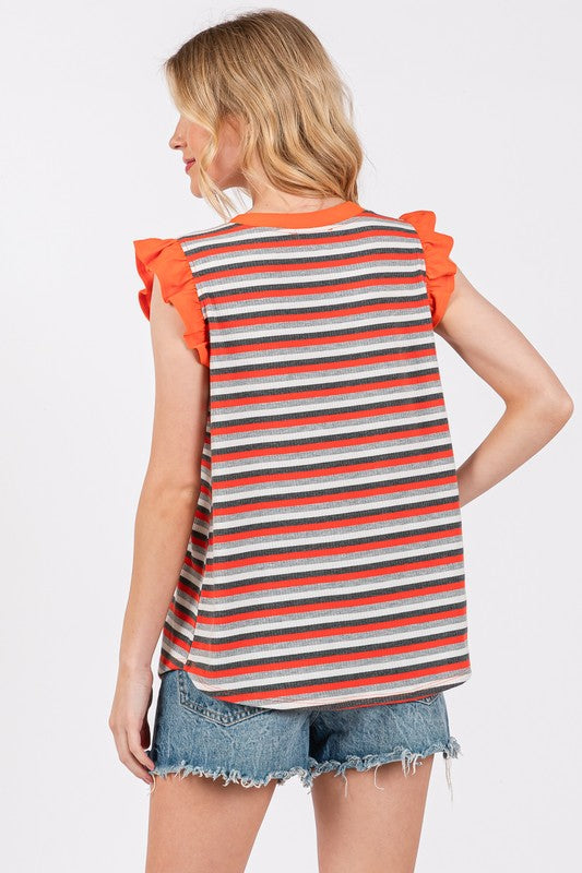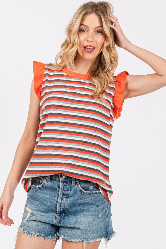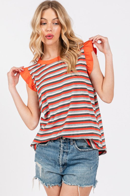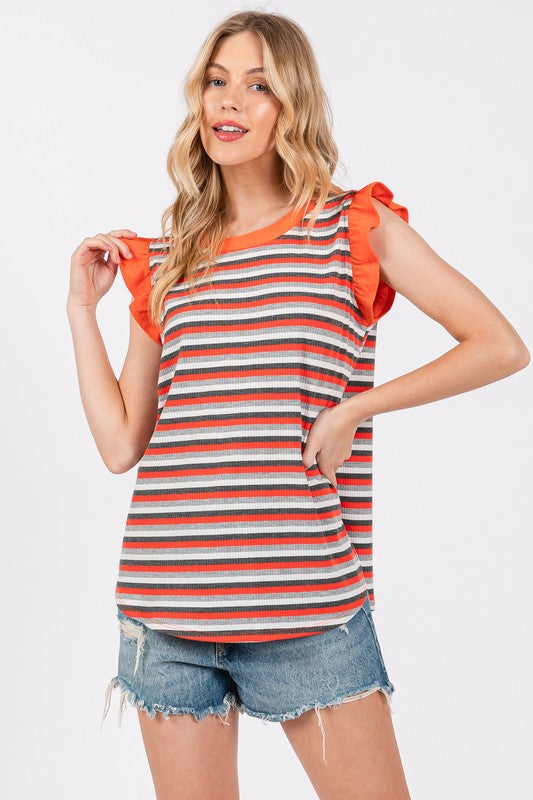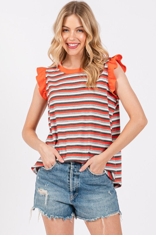 Ces Femme Striped Round Neck Ruffled Cap Sleeve Top