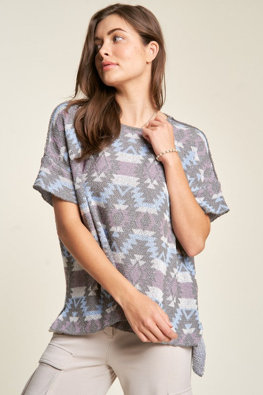 Davi & Dani High-Low Geometric Round Neck Knit Top